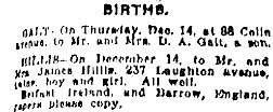 HILLIS – On December 14, to Mr. and Mrs. James Hillis, 237 Laughton Avenue, twin boy and girl. All well.