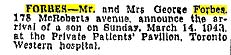FORBES – Mr. and Mrs. George Forbes, 178 McRoberts avenue, announce the arrival of a son on Sunday, March 14, 1943 at the Private Patients’ Pavilion, Toronto Western hospital.